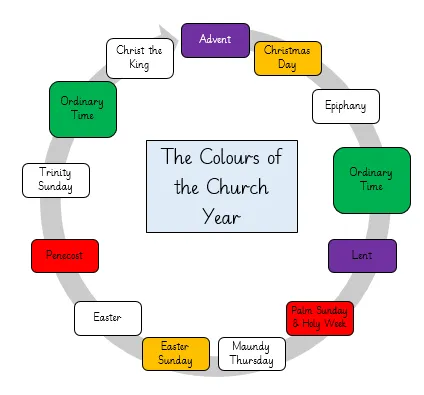 As a church school, this provides an ideal opportunity to mirror what is happening in our parish and local church. It also provides a colourful and visual way to mark the festivals throughout the year. Most churches will use different coloured vestments (a priest’s clothing) and altar cloths as signs of the season of the church year.