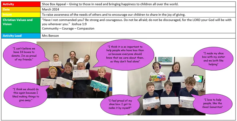 Through meaningful participation in charitable initiatives such as fundraising for Christian Aid and the Shoe Box Appeal, our children experience how Christian values can be lived out in service to others.